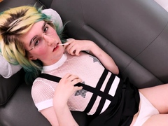 Skinny shemale with small cock jerks off and cums on her